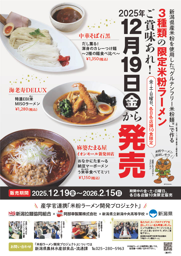 「米粉ラーメン開発プロジェクト」で完成した3種類の米粉ラーメンが期間限定で販売中です!