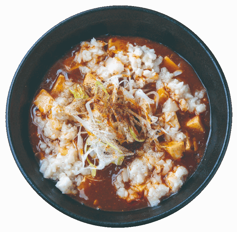 背脂推しのラーメン店。とんこつと鶏ガラを主体としたスープは、看板メニューの麻婆麺に合うよう比較的ライトな仕上がりに。麻婆あんは辛み強めだが、トッピングされた背脂の甘みが全体をマイルドな味わいにまとめてくれる。